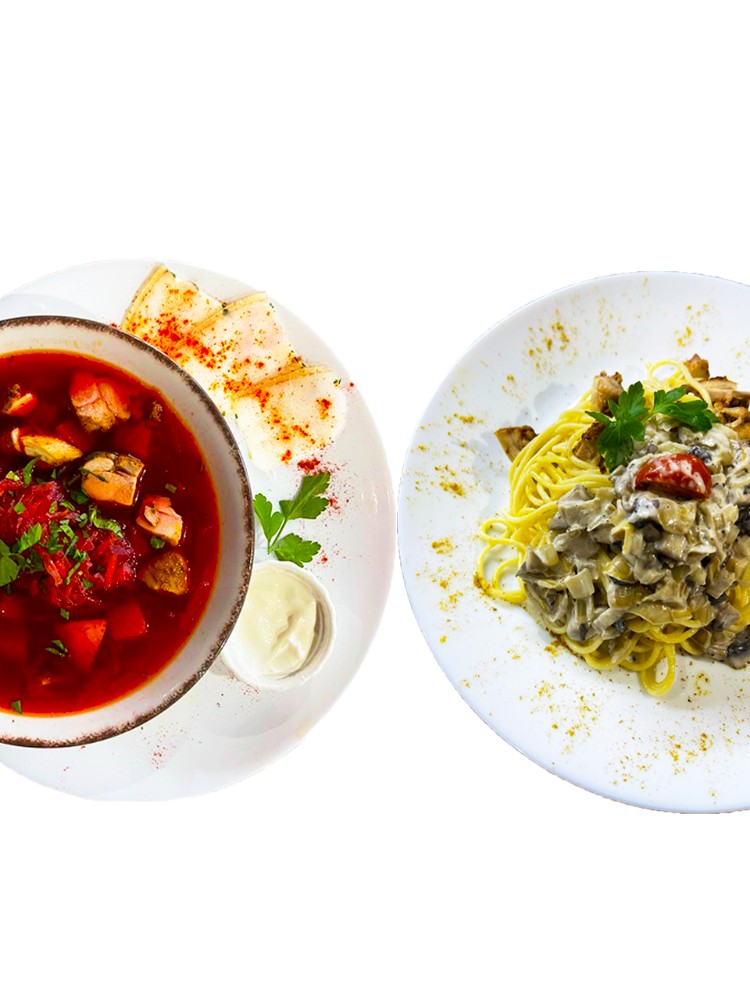Борщ с мясом, спагетти с курицей и грибами в сливочном соусе, ( хлеб 2 шт, сметана, сало).